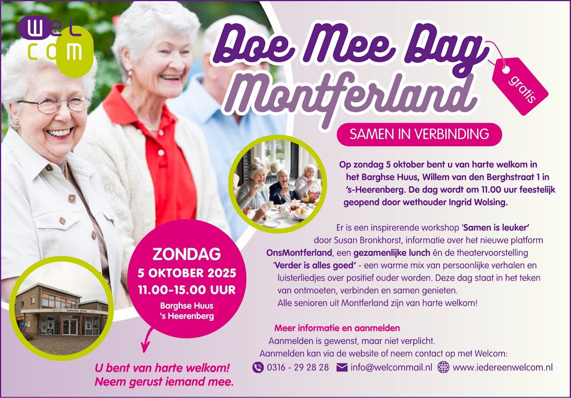 Deze dag staat helemaal in het teken van ontmoeten, verbinden en samen genieten. Alle senioren uit Montferland zijn van harte uitgenodigd!👉 Meer informatie & aanmelden