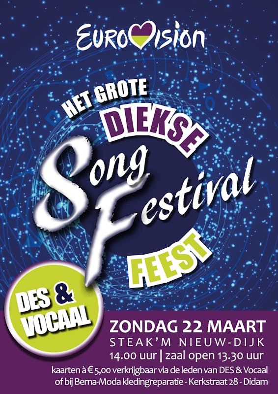 Op zondag 22 maart presenteren DES en Vocaal "Het Grote Diekse Songfestival Feest".