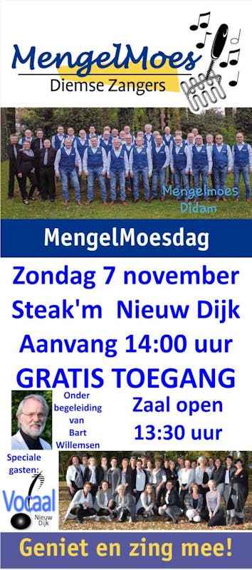 Dus zin in sfeervolle, gezellige en muzikale klanken door de Diemse zangers en de Diekse zangeressen? Kom dan 7 november naar Steak'm in Nieuw-Dijk!