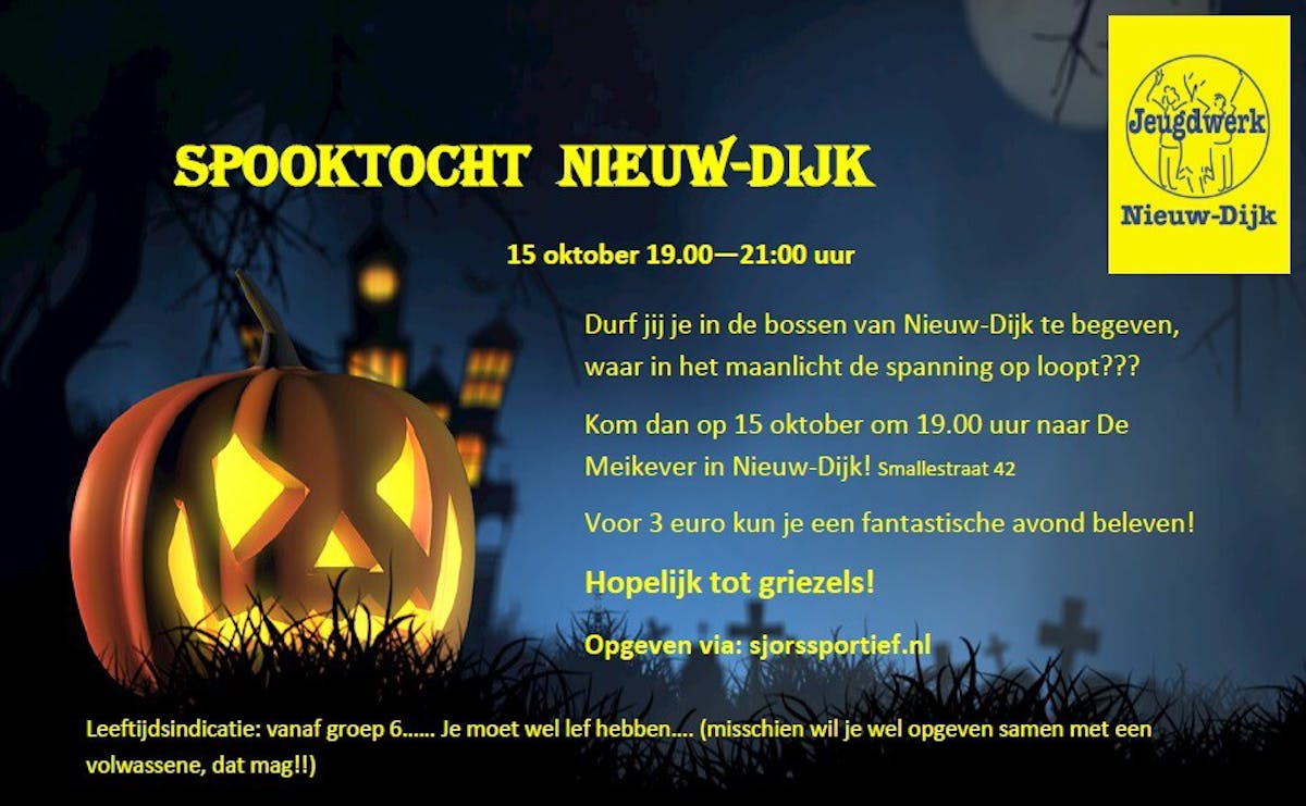 Zaterdagavond 15 oktober zal het weer spoken in en om de bossen van Nieuw-Dijk. Geef je op als je durft.. leeftijdindicatie vanaf groep 6 van de basisschool. Oudere jeugd en ouders zijn ook welkom. 3 euro p.p.