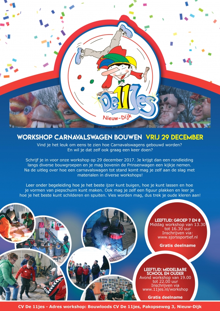 Een speciale avondworkshop voor de jeugd vanaf 12 jaar die nog meer willen weten over Carnavalswagens bouwen. Op deze avond gaan we uitgebreid in op de diverse technieken die je kunt toepassen én kun je zelf ook aangeven waar je nog meer over wilt weten. Ervaren bouwers vanuit de vereniging helpen je graag! Er zijn ook enkele bouwers van 'de Triple prijswinnaar van 2017 - De Dröpkes' aanwezig, zij nemen twee frames van koppen mee en helpen je graag deze op de juiste manier af te maken.