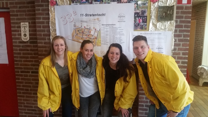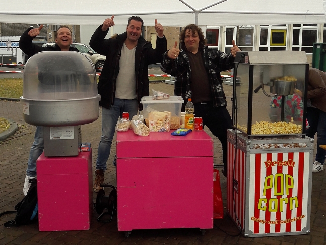 Geweldig: 4 leden van de vriendengroep Boejes die de organisatie van de 11 stratentocht helpen met de organisatie. En de vriendengroep Naamloos die op het plein de popcorn en de suikerspinnen vers voor de kinderen bereidde.