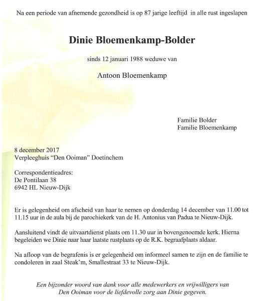Ons bereikte het trieste bericht dat Dinie Bloemenkamp-Bolder is overleden. Wij wensen haar naasten veel sterkte met dit verlies. Voor de volledige rouwadvertentie, kijk hieronder
