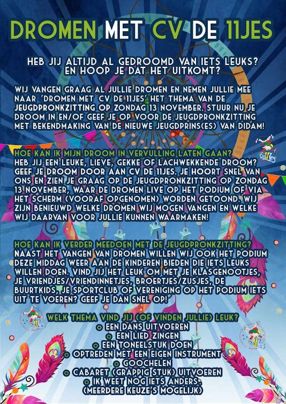Kinderen van de basisscholen in Didam hebben de mogelijkheid om hun droom door te geven en/of mee te doen met een leuk optreden met de Jeugdpronkzitting. CV De 11jes hoopt zoveel mogelijk dromen te kunnen vangen en wellicht wel enkele waar te maken!