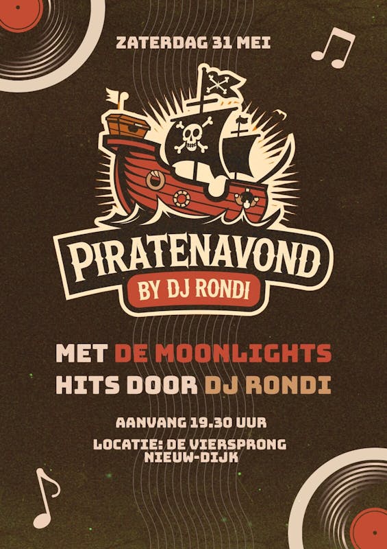 Ouderwetse piraten avond met leuke muziek van The Moonlights. In de pauze hits van DJ Rondi