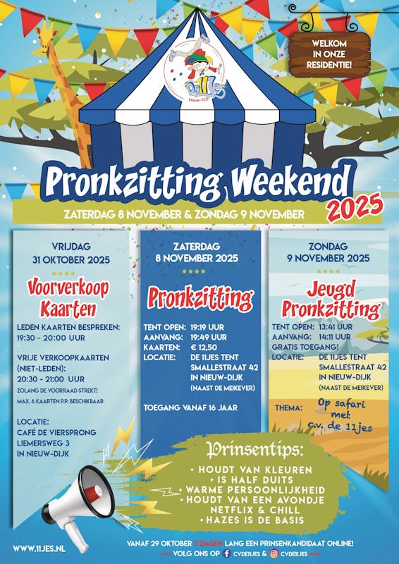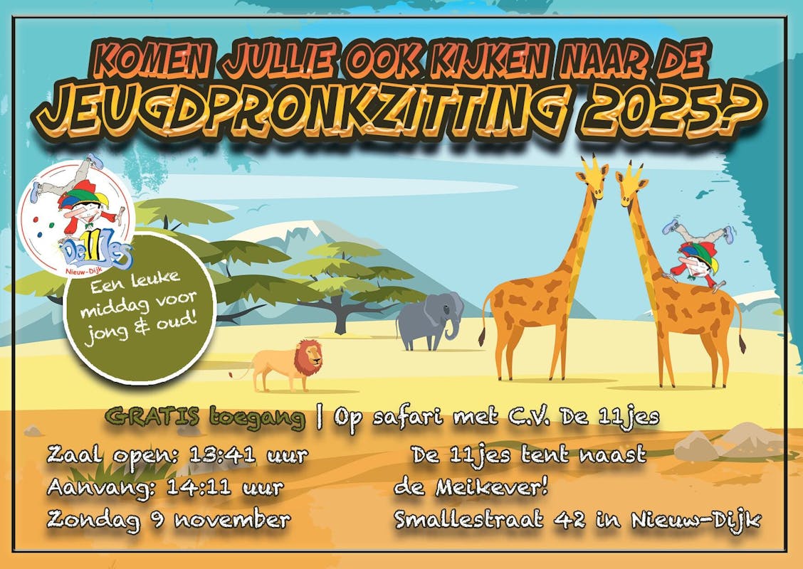 Een leuke, gezellige middag voor jong & oud, waarin alle deelnemende kinderen op leuke wijze te zien zijn op het podium. Zijn jullie ook zo benieuwd naar onze presentatoren, de avontuurlijke safari en de leuke dansen en toneelstukken? Laat je verrassen door het gevarieerde aanbod door de jeugd! Ook nemen wij afscheid van Jeugdprinses Lien 2de en presenteren wij de nieuwe Jeugdprins(es) tijdens de altijd spannende Prinsenpresentatie met de kinderen van groep 8 van basisschool De Expeditie. Jeugdpronkzitting C.V. De 11jesWanneer: zondag 9 november 2025 Locatie: 11jes tent naast de Meikever (Smallestraat 42) te Nieuw-Dijk Tijd: Tent open 13.41 uur | Aanvang 14:11 uur Gratis toegang!