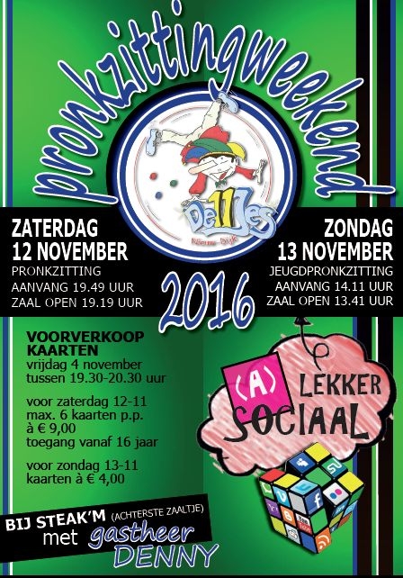 Op vrijdagavond 4 november kunt u tussen 19.30 en 20.30 uur kaarten kopen bij Steak'm (het zaaltje helemaal achterin). Maximaal 6 kaarten per persoon à € 9,-. Toegang vanaf 16 jaar. De kaarten voor de Jeugdpronkzitting kosten € 4,- per stuk voor volwassenen. Gratis toegang voor kinderen. Losse kaartverkoop voor aanvang van de Jeugdpronkzitting is mogelijk. Kom gezellig met je vrienden naar het 'achterste' zaaltje en drink een borrel met onze gastheer Denny mee.