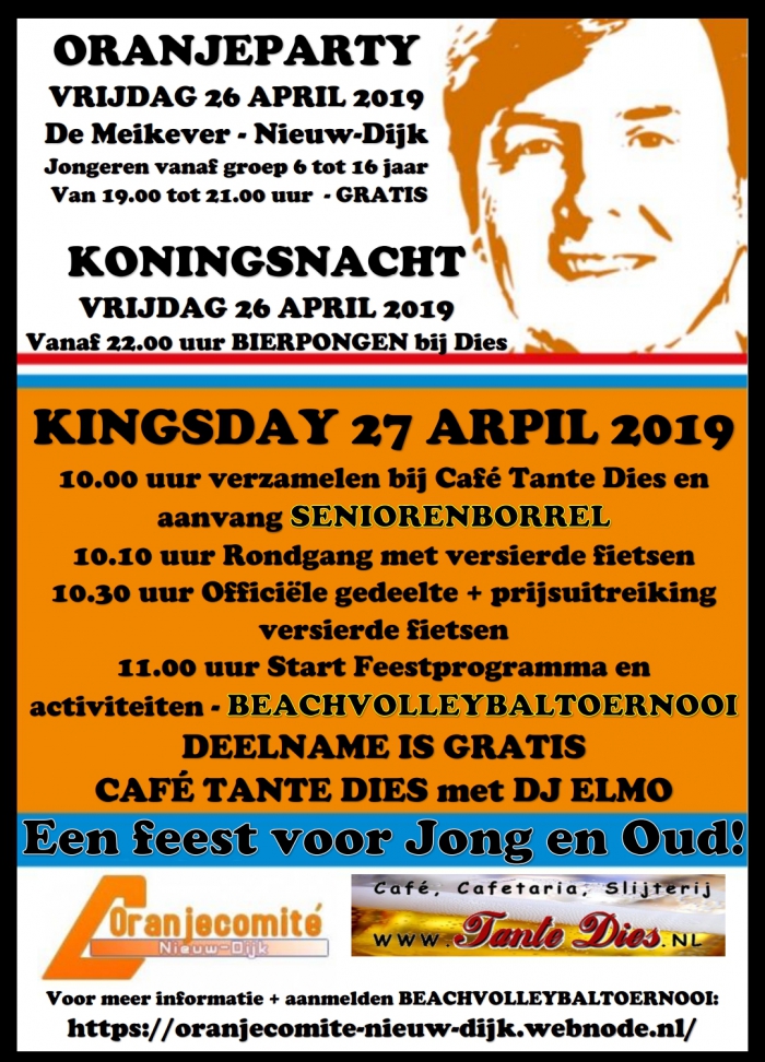 Het oranjecomité Nieuw-Dijk organiseert ook dit jaar weer een feestprogramma voor alle kinderen, hun ouders en belangstellenden. Ook dit jaar is het middagprogramma in samenwerking met "Tante Dies".