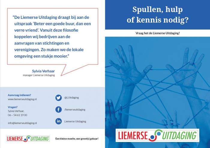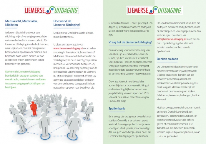 De Liemerse Uitdaging bemiddelt in Materialen, Middelen en Menskracht. Dat vertaalt zich door vragen van verenigingen en stichtingen te matchen met aanbod in natura van ondernemers uit de Liemers. 'We geven geen geld, maar zoeken concrete oplossingen. We maken gebruik van het netwerk van de matchgroepleden en dat is in de afgelopen twee jaar in Montferland en Duiven succesvol gebleken', aldus Sylvia Verhaar die als manager van de Liemerse Uitdaging haar bijdrage levert.