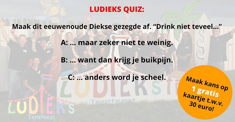 We hebben ook nog een leuke QUIZ waarmee je een leuke prijs kunt winnen, namelijk een gratis kaartje voor LuDieks Tentfeest. Klik op onderstaande linkje, beantwoord alle vragen goed en maak kans op gratis kaarten voor het Ludieks Tentfeest. De Quiz kan alleen worden gedaan in Facebook Messenger.