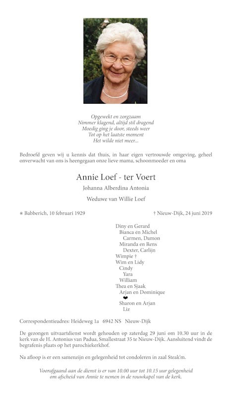 Ons bereikte het trieste bericht dat mevrouw Annie Loef - ter Voert is overleden. Wij wensen haar naasten veel sterkte met dit verlies. Voor de volledige rouwadvertentie, zie digiDIEK mevrouw Loef - ter Voert.pdf