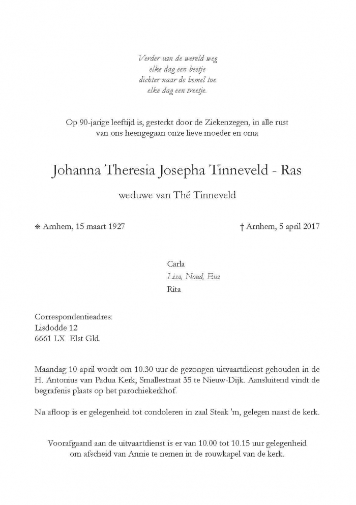 Ons bereikte het trieste bericht dat mevrouw Tinneveld-Ras is overleden. Wij wensen haar naasten veel sterkte met dit verlies.