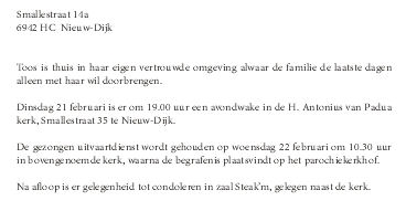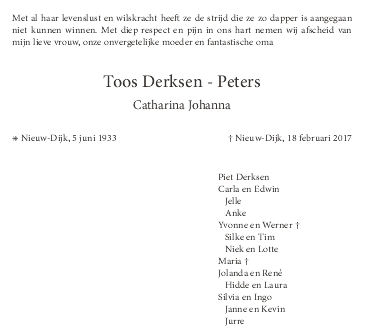 Voor de volledige rouwadvertentie, zie 20170219 Rouwbrief mevrouw Derksen - Peters.pdf