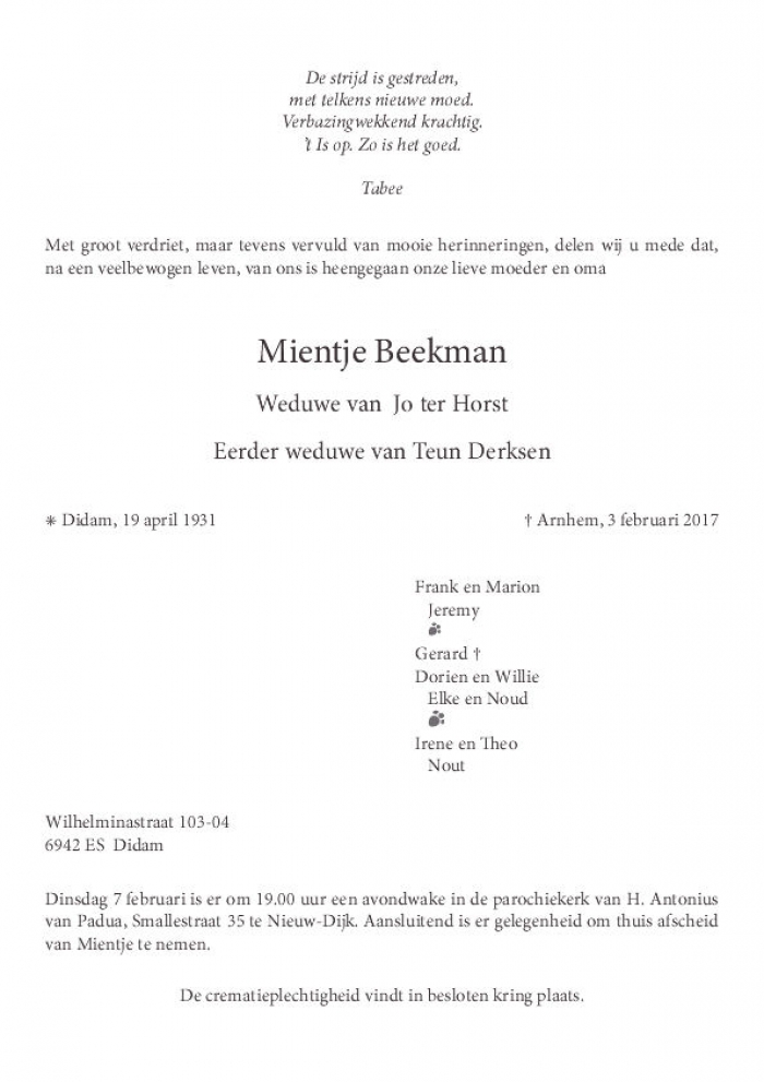 Zie onder de rouwbrief van Mientje Beekman;