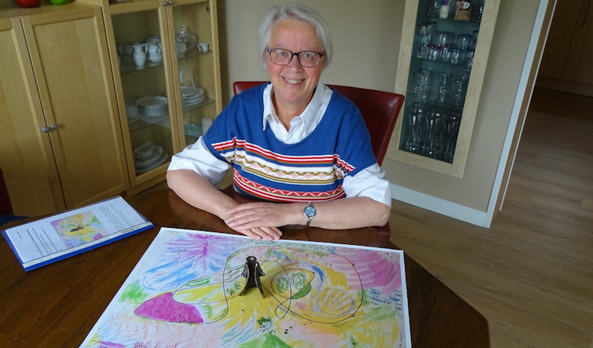 Foto: Marjan Minke met de tekening die symbool staat voor haar plan. “Laten we de mantelzorger centraal zetten. Daarbij moeten we misschien af en toe eens buiten de lijntjes denken, over de grenzen van de bestaande regeltjes en structuren heen.