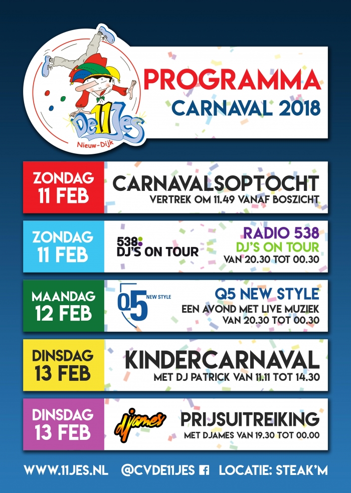 Op de website van CV De 11jes staat het volledige programma voor Carnaval 2018!