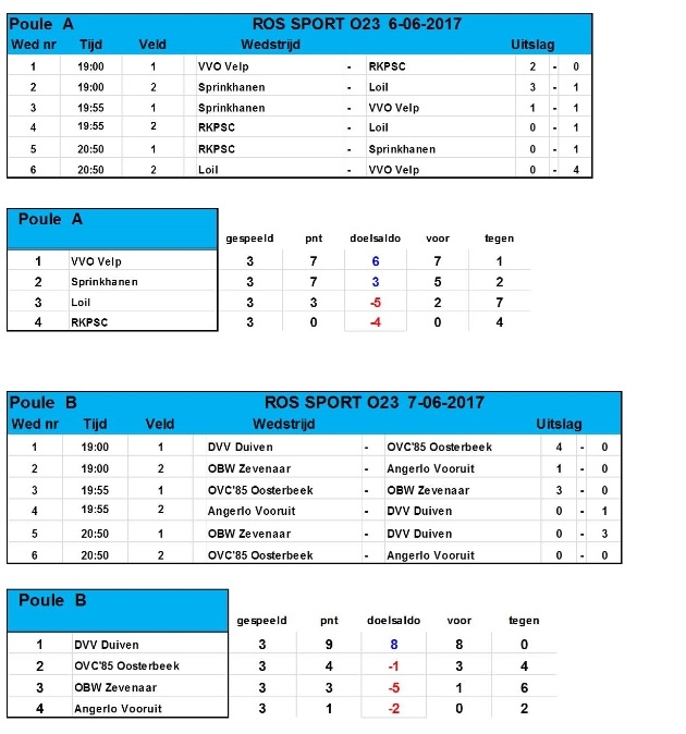Uitslagen van de wedstrijden in Poule A en Poule B.