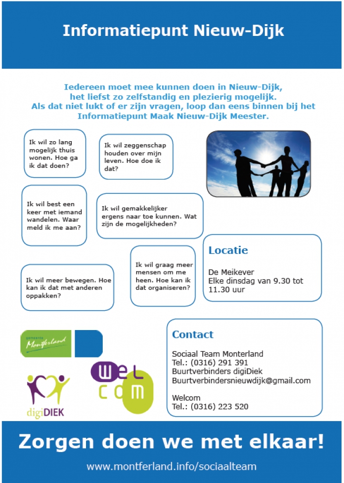 Infopunt Het infopunt: waar je terecht kan met vragen omtrent zorg, wonen, vervoer, sociale zaken, blijft wel bestaan voor inwoners van Nieuw-Dijk. Wij proberen met u mee...
