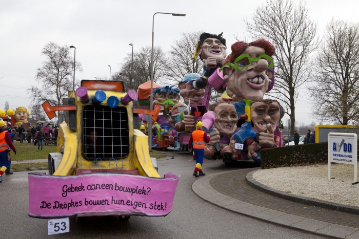 "Gebrek aan een bouwplek? Met deze wagen bouwen we aan onze eigen stek!",met deze leus sleepten de Dröpkes de wisseltrofee bij CV De 11jes in Nieuw-Dijk in de wacht. De veelzijdige groep bestaande uit 20 leden uit Nieuw-Dijk, Oud-Dijk, Loil, Didam en zelfs Babberich is voor de derde keer op rij eerste geworden.