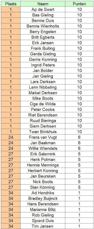 Er zijn 23 mensen met de juiste uitslag die 10 punten ontvangen.