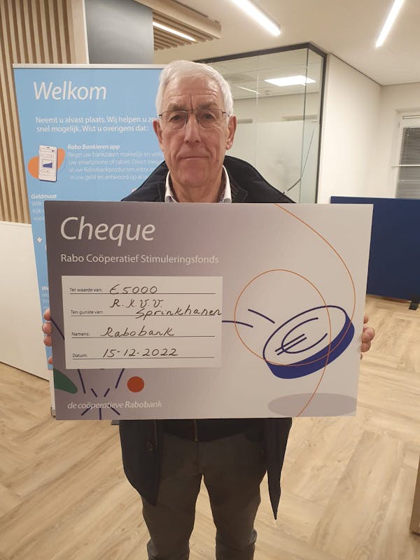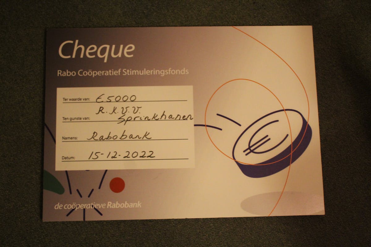 Vorige week ontving onze voorzitter uit handen van de Rabobank een cheque van 5000,- euro voor verduurzaming van onze accommodatie.
