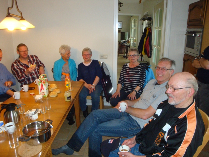 Uiteraard was er tijd voor een kop koffie met een krentenbol, letterlijk “on the road”. Daarna de nazit bij Eric, waar het heel gezellig was en luidruchtig nagepraat werd.