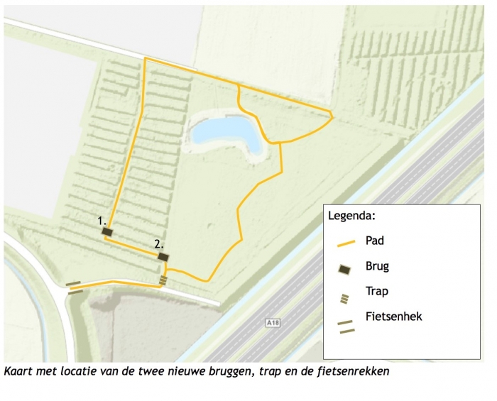 Vorig jaar hebben we alle bruggetjes verstevigd en van stevige leuningen voorzien. Ook zijn planken van de bruggetjes stroef gemaakt om uitglijden te voorkomen. Er wordt ook steeds meer gewandeld in het bos. Om ook eens een wat ander wandelingetje te kunnen maken gaan we dit jaar een paar extra paden maken bij de paddenpoel.