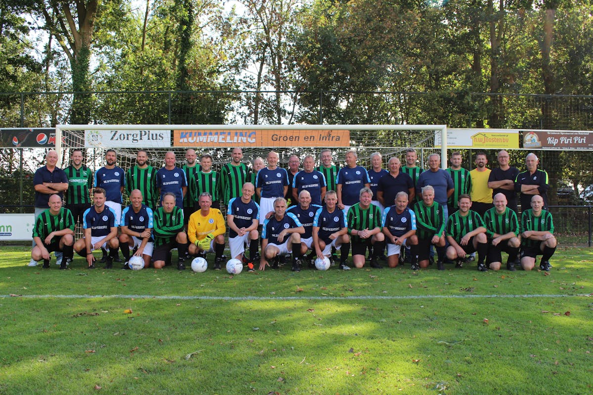 Op de foto beide teams met in het midden onze huidige trainer van Sprinkhanen 1 oud Graafschap-speler John Leeuwerik.