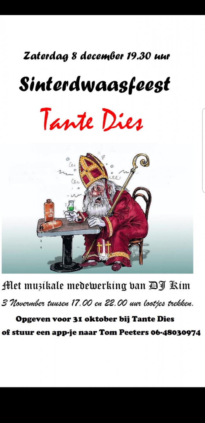 Na het daverend succes van vorig jaar heeft sinterklaas besloten dit jaar weer een paar dagen langer te blijven om dies te bezoeken. Samen met zijn zatte pieten hoopt hij er weer een groot spektakel van te maken!! Toegankelijk voor iedereen!!