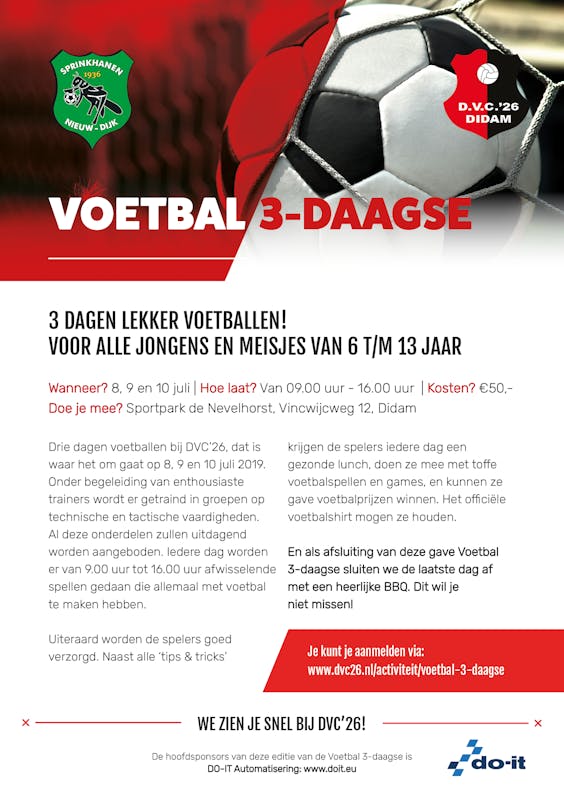 Op 8-9 en 10 juli kun je deelnemen aan de voetbal 3-daagse bij Dvc`26.